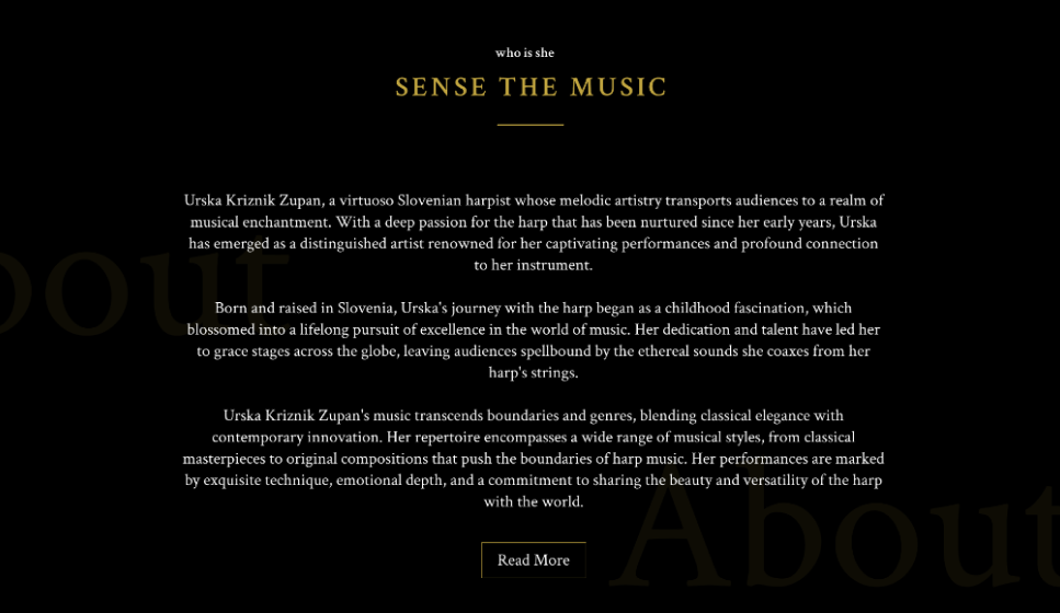 The website offers visitors an immersive experience, with intuitive navigation and visually striking elements that highlight the harpist’s talent. Discover how our design expertise brought the harpist’s artistry to the digital stage, creating an enchanting and engaging platform for music lovers.